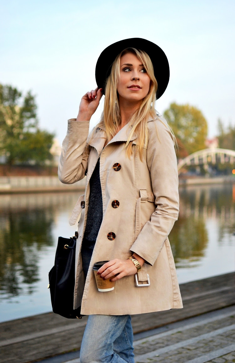 Klasyczny trencz chodził za mną od dawna. Jednak moje poszukiwania idealnego beżowego płaszcza nie należały do najłatwiejszych. Przejrzałam chyba wszystkie modele dostępne w sieciówkach, lecz żaden z nich nie spełniał moich oczekiwań. Raz fason nie ten, raz kolor czy zbyt wygórowana cena. Po raz kolejny niezawodny okazał się lumpeks. Podczas zupełnie spontanicznych zakupów moim oczom ukazał się idealny, jasny trencz. Dokładnie taki - jaki sobie wyobrażałam. W dzisiejszej stylizacji nie tylko on pochodzi z ciuchlandu. Bluzka, jeansy oraz kapelusz to również moje lumpeksowe zdobycze. Jak widać drogie nie znaczy lepsze! Dzisiejsza propozycja to idealny strój na uczelnie czy spacer. Do mojego codziennego zestawu niezbędny jest jeszcze jeden element - dobra kawa! :)